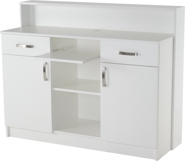 Prednja pleksiglas ploča s LED rasvjetom Opremljena ormarićima, ladicama, policom i izvlačnom ladicom Visina radne ploče: 90 cm Ugradnja brava kao opcija