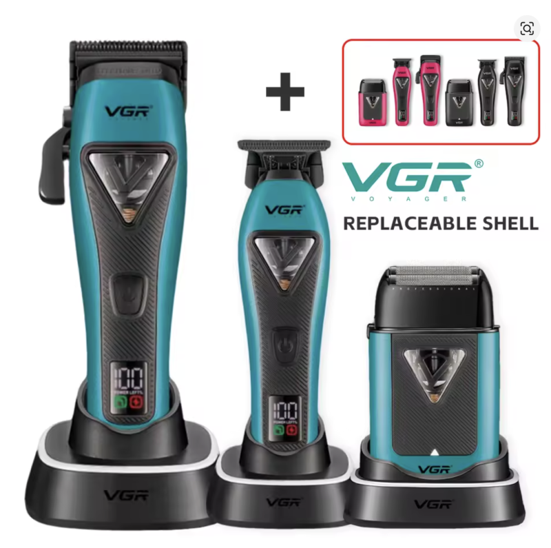 Ovaj set je apsolutno remek-djelo i posveta brijačima! Masivan i impresivan set vrhunske VGR opreme. Šišač, trimer i brijač s vektorskim motorima. Šišač i trimer nova su evolucija dobro poznatog i voljenog V-015, ovaj put s još većom baterijom i LED zaslonom. Šišač V-035C: - super tih, gladak i izuzetno snažan vektorski motor - baterija od 3000 mAh za 3 sata rada - 3 izmjenjive navlake u boji - stanica za punjenje - savršen set magnetskih dodataka Trimer V-035T - super tih, glatko radeći i izuzetno snažan vektorski motor - Baterija od 2000 mAh za 2,5 sata rada - 3 izmjenjive navlake u boji - stanica za punjenje - set utičnica Brijač V-035s - super tih, glatko radeći i izuzetno snažan vektorski motor - UV sustav za dezinfekciju oštrica - 3 izmjenjive navlake u boji - stanica za punjenje dodatno uključeno u set: četka za blijeđenje, plašt, kopče, USB kabeli za istovremeno spajanje sva 3 uređaja, rezervni vijci za kućišta i ulje za oštrice