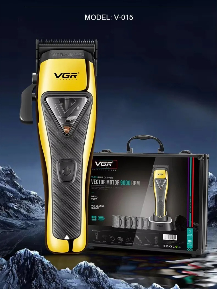 VGR-v-015 mašinica za šišanje s vektorskim motorom 9000 o/min Profesionalni mašinica za šišanje VGR V-015 je visokoučinkoviti alat za njegu dizajniran za profesionalne brijače i osobnu upotrebu. Ima snažan vektorski motor koji radi na 9000 okretaja u minuti , osiguravajući učinkovito i precizno šišanje kose. Ključne značajke: Oštrice s DLC premazom: Trimer je opremljen oštricama obloženim dijamantnim ugljikom (DLC), što pruža izdržljivost i glatko rezanje. Podesiva duljina rezanja: Nudi podesivu duljinu rezanja u rasponu od 0,8 mm do 2,0 mm, što omogućuje svestrane mogućnosti stiliziranja. Magnetni češljevi za vođenje: Mašinica za šišanje uključuje šest magnetskih češljeva za vođenje, što omogućuje prilagodljivu duljinu rezanja od 0,8 mm do 13 mm. Dugo trajanje baterije: Litijeva baterija od 2500 mAh omogućuje do 120 minuta neprekidne upotrebe nakon 3 sata potpunog punjenja, osiguravajući neprekinuto njegu. Ergonomski dizajn: Dizajniran za udobnost i jednostavnost korištenja, ergonomska konstrukcija trimera osigurava siguran hvat tijekom rada. Tihi rad: Unatoč snažnom motoru, V-015 radi tiho, poboljšavajući korisničko iskustvo.