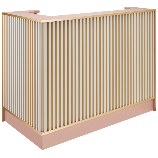 Kutni recepcijski pult Korpus od laminirane ploče Fronta od lameliranih ploča, dostupna u 5 boja Postolje s LED rasvjetom Visina radne ploče: 80 cm